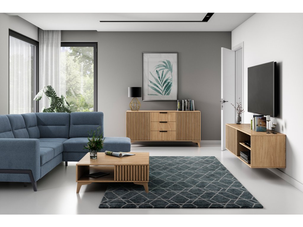 Suportul de perete aduce în locuința dumneavoastră o soluție elegantă, care economisește spațiu și în același timp creează o impresie de lejeritate și spațiu. Datorită montării pe perete, oferă nu doar un aspect modern, ci și o întreținere ușoară a pardoselii de sub acesta. Designul său bine gândit oferă suficient spațiu de depozitare pentru dispozitive multimedia, cărți sau decorațiuni, păstrând în același timp o impresie minimalistă. Finisajul în decor de stejar artisan aduce o atmosferă plăcută în interior și se combină ușor cu alte elemente de mobilier. Suportul de perete este alegerea ideală pentru cei care caută o îmbinare între funcționalitate și stil sofisticat.
