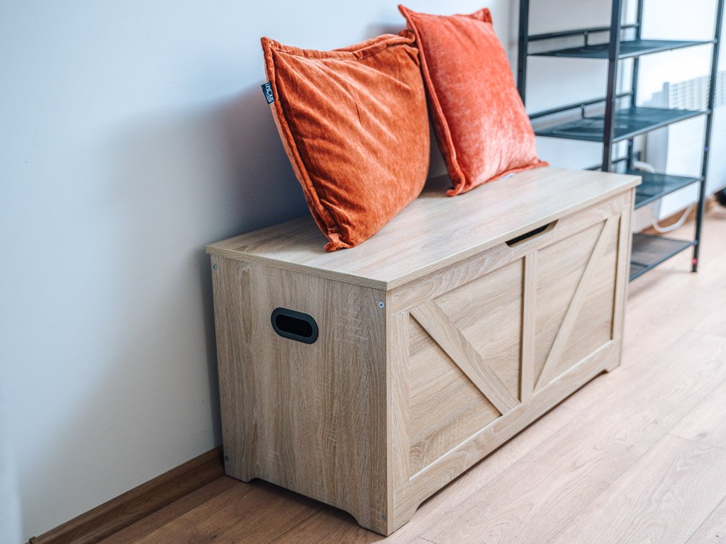 Cutia este echipată cu feronerie de siguranță, care permite oprirea capacului sub un unghi de 60° sau mai mic, asigurând o utilizare confortabilă și sigură. Este ideală pentru dormitor, hol sau camera de zi, unde poate servi nu doar ca spațiu de depozitare, ci și ca băncuță practică. Mânerele laterale facilitează transportul cutiei după necesitate.