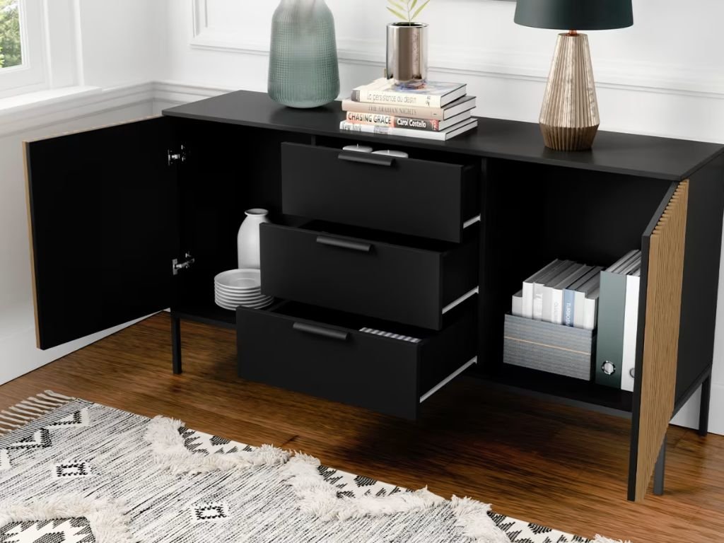 Aduceți stil și funcționalitate în casa dvs. datorită unei soluții de depozitare bine gândite, care combină estetica și practicitatea. Comoda se potrivește perfect ca accesoriu elegant în living, birou sau antecameră și combinarea dulapurilor, sertarelor și spațiului deschis permite aranjarea liberă a decorațiunilor, cărților sau necesităților zilnice. Datorită designului curat în specificația neagră, ies în evidență și accesoriile minimaliste, lumânările sau plantele, care adaugă un caracter personalizat interiorului. Folosiți fiecare spațiu la maximum și creați un mediu care va reflecta stilul și necesitățile dvs.