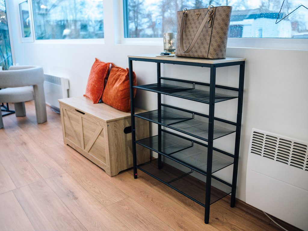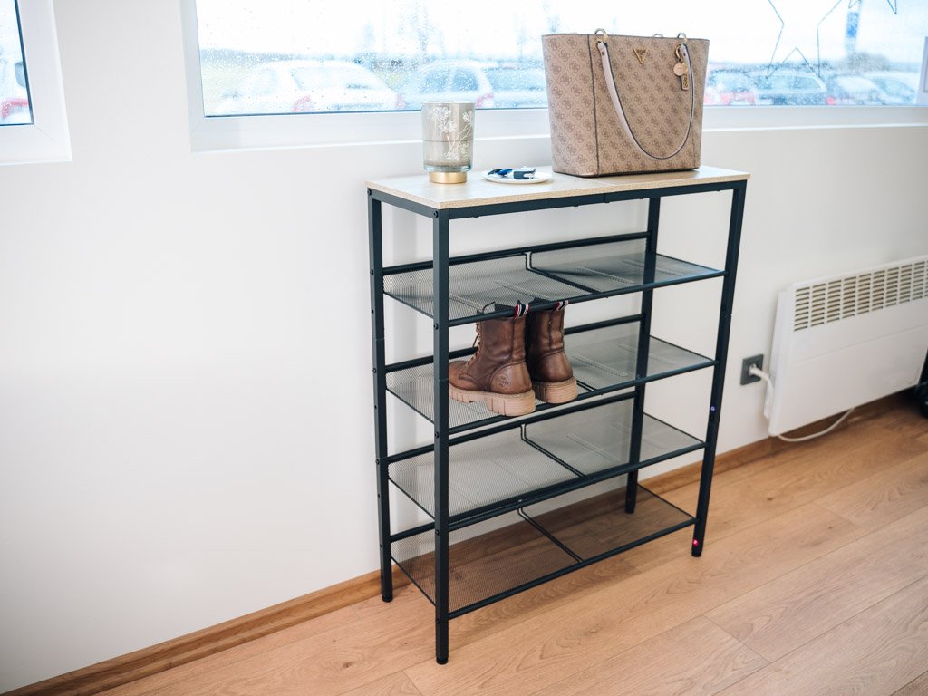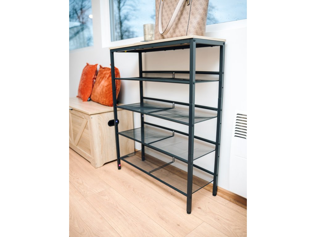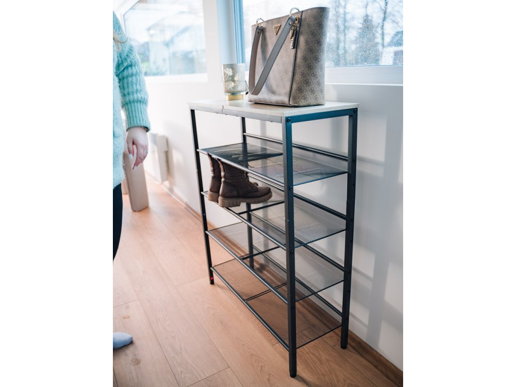 Suport pentru pantofi universal și stilat oferă mai mult decât un loc de depozitare pentru încălțămintea dumneavoastră. Datorită celor patru rafturi spațioase și blatului robust, poate găzdui nu doar pantofi, dar și alte accesorii sau decorațiuni. Posibilitatea de a alege înclinarea rafturilor vă permite să adaptați suportul exact nevoilor dumneavoastră – rafturile înclinate pentru acces ușor sau cele drepte pentru stabilitatea obiectelor depozitate. Perforația rafturilor favorizează circulația aerului, ideală pentru păstrarea încălțămintei în stare bună. Picioarele ajustabile asigură stabilitate chiar și pe podele inegale, iar combinația elegantă de decor stejar și oțel negru se potrivește ușor în interiorul modern. Acest suport poate fi utilizat și ca etajeră multifuncțională – pentru cărți, plante sau alte mici obiecte. Alegerea perfectă pentru oricine caută o soluție funcțională și estetică în același timp.