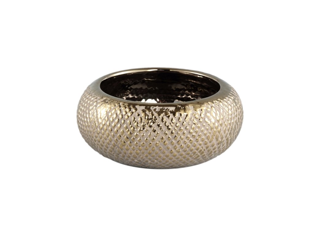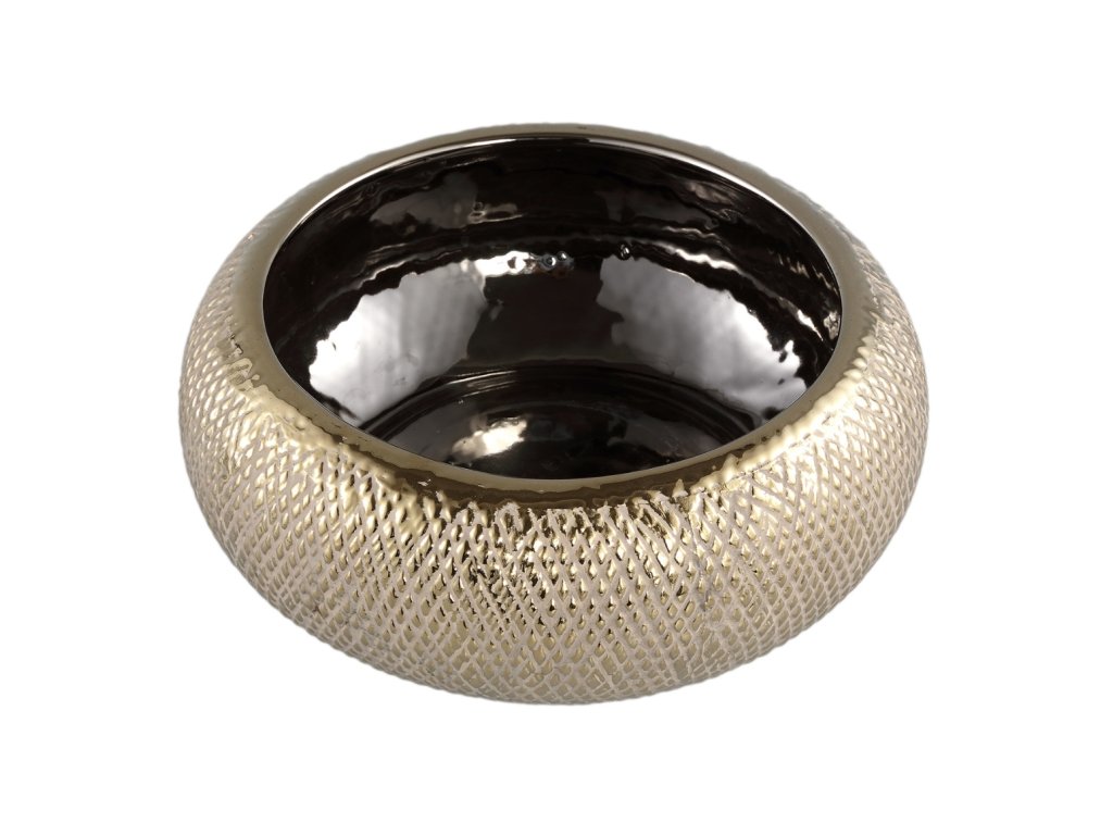 Vas de flori din ceramică auriu HELLY GOLD este un accesoriu elegant care adaugă lux și stil în orice interior. Datorită formei sale rotunde și joase, precum și designului său reliefat detaliat, este original și sofisticat. Este perfect pentru plante mai mici sau ca element decorativ pe masă sau raft.