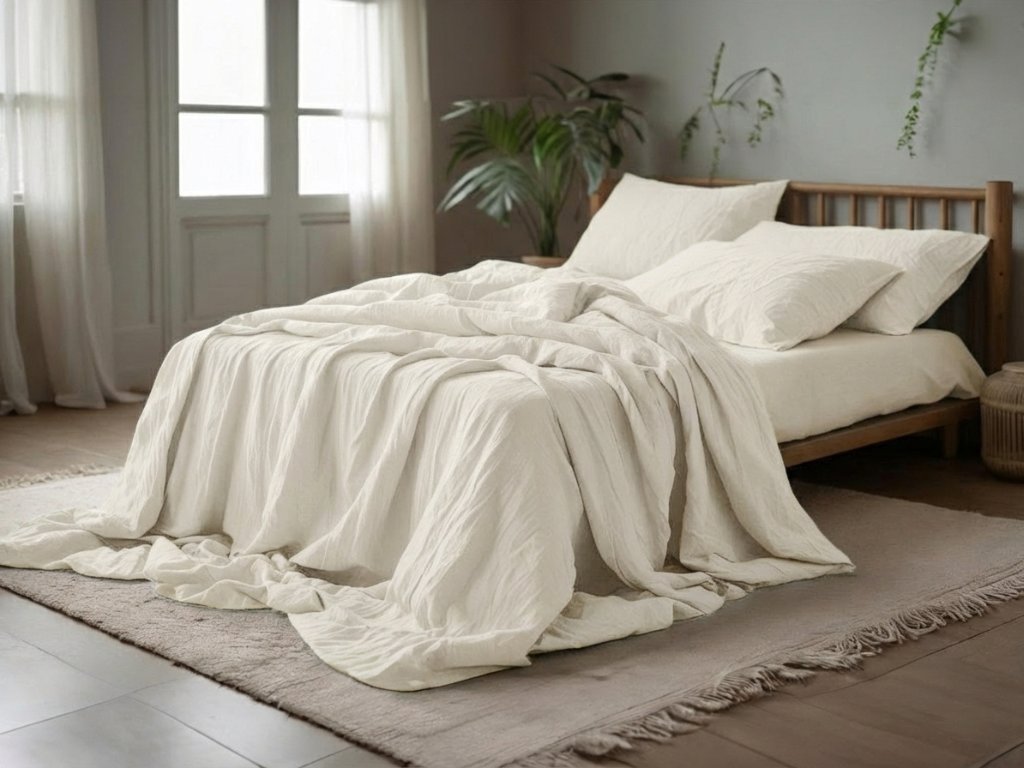 - Lenjerie 200 × 200 cm: 1× husă pentru pilotă | 2× huse pentru pernă 80 × 80 cm