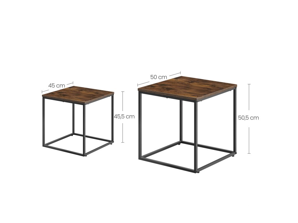 Acest set de două mese cu o notă industrială va adăuga stil modern și funcționalitate interiorului tău. Datorită construcției metalice, mesele sunt puternice și stabile, în timp ce capacitatea de a glisa o masă sub cealaltă economisește spațiu atunci când nu sunt folosite. Sunt perfecte ca măsuțe de cafea, zone de depozitare sau noptiere, iar datorită aspectului lor universal, le puteți integra cu ușurință în diferite tipuri de interioare.