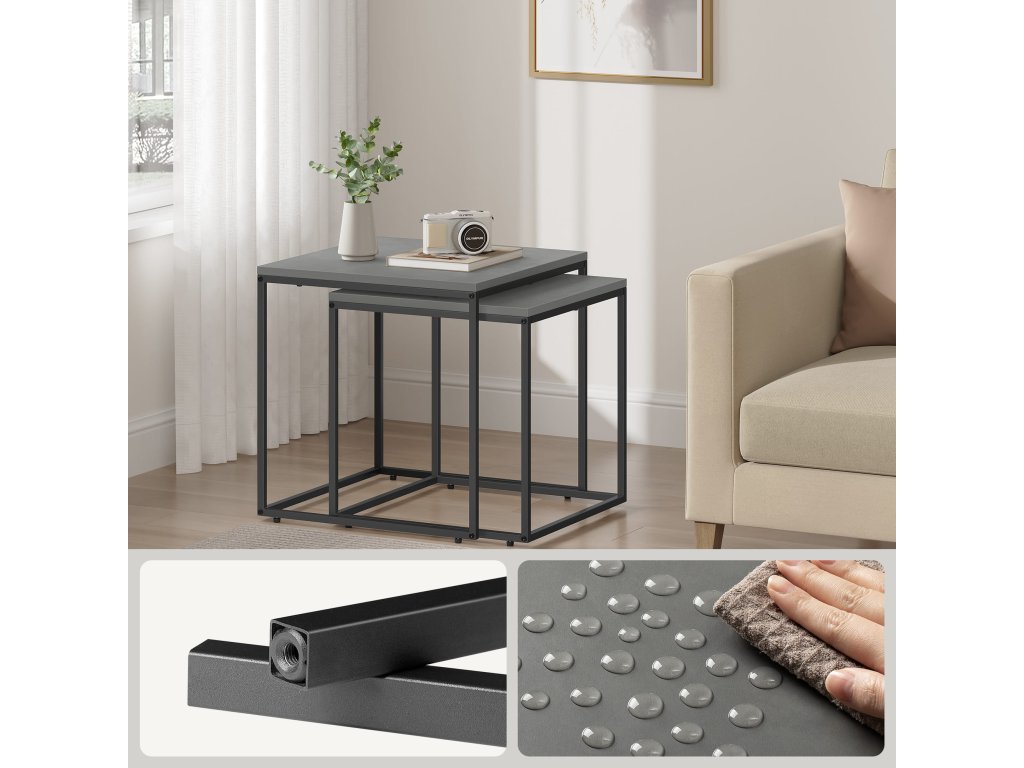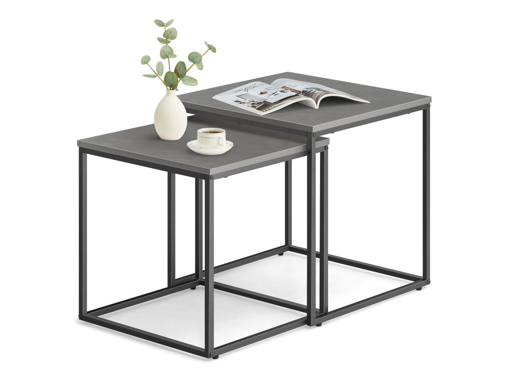 Acest set de două mese cu o notă industrială va adăuga stil modern și funcționalitate interiorului tău. Datorită construcției metalice și suprafeței care imite betonul, mesele sunt puternice și stabile, în timp ce posibilitatea de a glisa o masă sub cealaltă economisește spațiu atunci când nu sunt folosite. Sunt perfecte ca măsuțe de cafea, suprafețe de depozitare sau noptiere, iar datorită aspectului lor universal, le puteți integra cu ușurință în diferite tipuri de interioare.