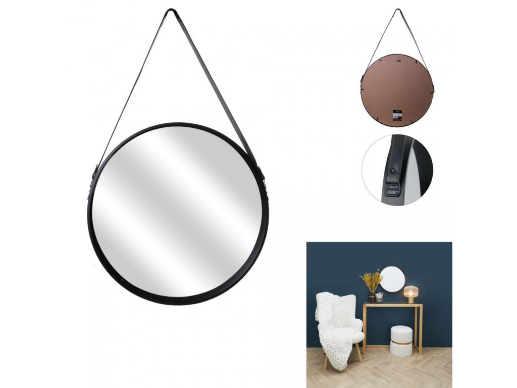 Oglinda rotunda neagra cu curea din piele, NAHAD Ø50 cm