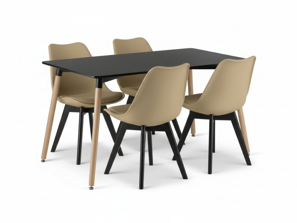 Elegantní spojení černé a béžové barvy vytváří harmonický kontrast, který oživí vaši jídelnu. Židle s ergonomickým tvarováním a měkkým sedákem poskytují pohodlí pro každodenní stolování, zatímco pevný stůl s kovovým rámem zaručuje stabilitu a dlouhou životnost. Stylový design s čistými liniemi perfektně zapadne do moderního i minimalistického interiéru.