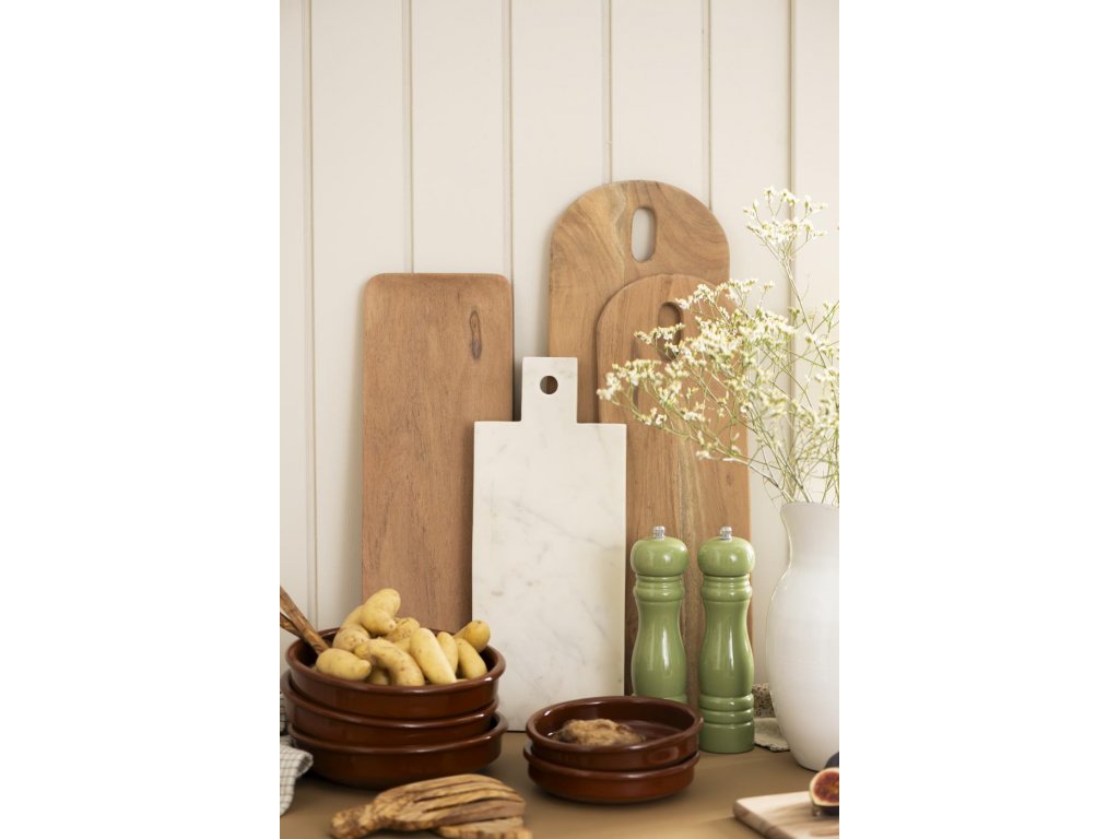 În bucătărie contează nu doar gustul, ci și prezentarea. Această frumoasă planșetă din lemn de acacia va deveni un ajutor indispensabil în pregătirea mâncărurilor și servirea cu stil. Indiferent dacă aranjați pe ea o selecție de brânzeturi și mezeluri pentru prieteni, pâine proaspăt coaptă sau fructe delicioase, va adăuga întotdeauna o notă elegantă și naturală mesei dumneavoastră. Datorită desenului său unic, fiecare planșetă este unică și va deveni un frumos supliment pentru orice bucătărie. Bucurați-vă de plăcerea de a găti și de a servi cu un strop de natură chiar pe masa dumneavoastră.